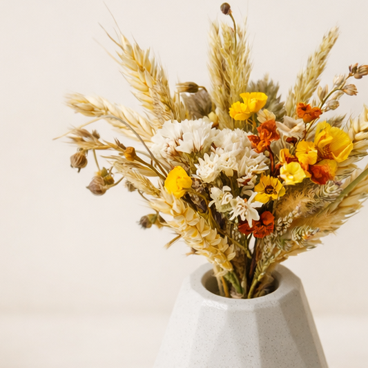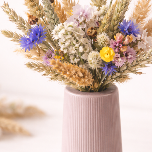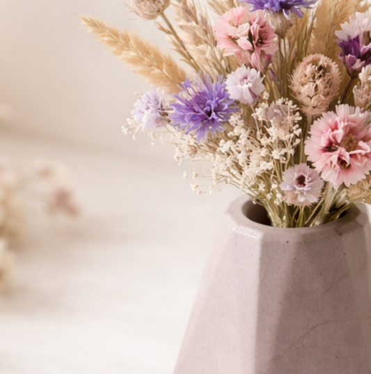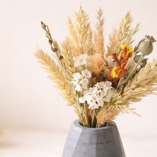 Kytičky sušené a sbírané v jižních Čechách v betonové vázičce.